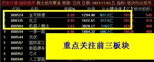 4、热度数值大于100时视为当天热点,一般选排序前3的板块。