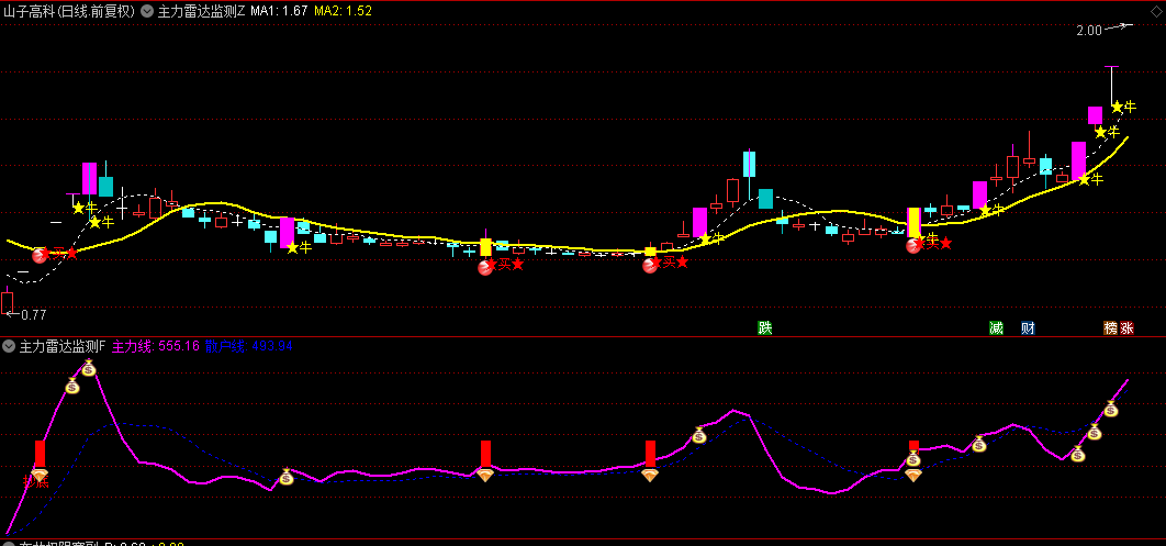 当主力线向上突破时,再综合多种市场信号和技术指标,当所有条件满足时,将触发”黄钻石”买点信号,这往往预示着股票价格的上涨趋势。