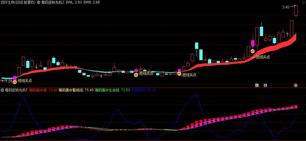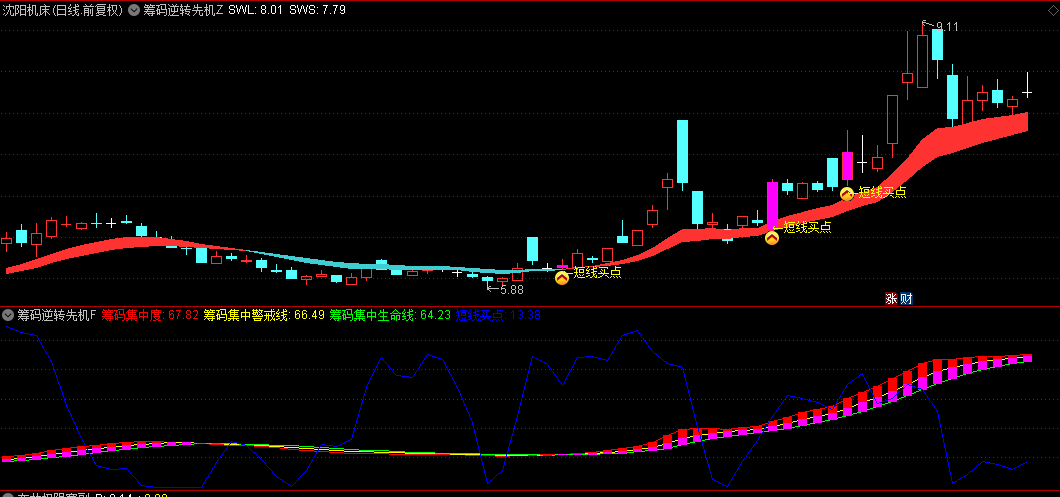 短线买入标识:在特定情境下,蓝色参考线跃居筹码趋势线之上,并伴随红色或紫色柱的多头信号,主图将亮出黄色的短线买入标识,作为短线交易的明确入场信号,鼓励交易者积极布局。此信号亦可用于智能选股,进一步提升交易效率。