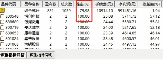 特别注意:本人所有测评公式的平仓条件是收盘价,非最高价,有些人用的是最高价来回测其胜率和盈亏比,数据看上去都很漂亮,这是不严谨的,试问你能次次卖到最高点吗。