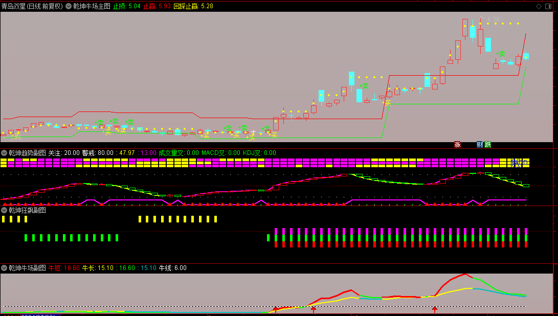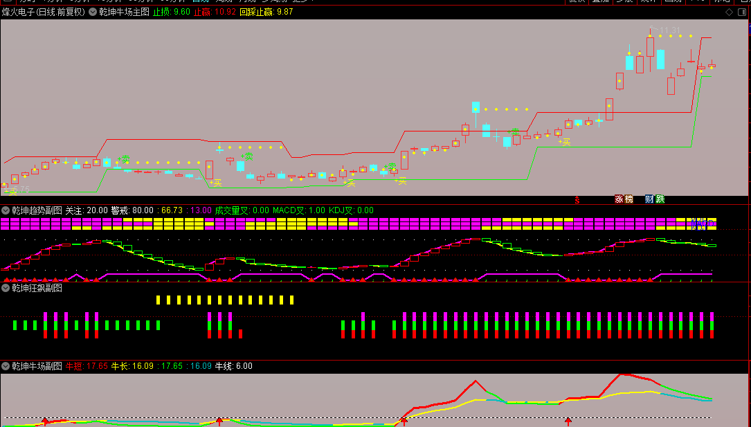 全套指标包含了乾坤牛场主图、乾坤趋势副图、乾坤狂飙副图、乾坤牛场副图四个指标,一个主图,三个副图,全部源码分享!