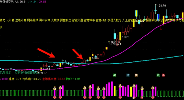 通过观察紫色柱强度的变化,投资者可以评估主力资金的投入力度,判断市场上涨潜力。