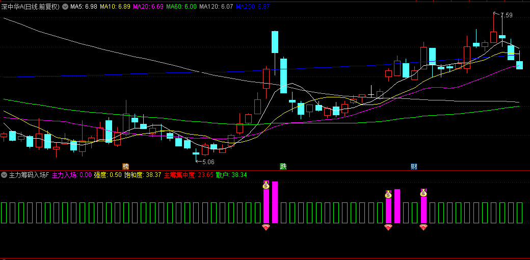 紫色柱的强度直接反映主力资金的入场状况。紫色柱增强时,表明主力资金正积极进入市场,预示市场可能上涨;若紫色柱变弱,则可能意味着市场的回调或调整即将到来。