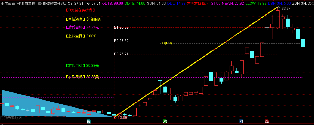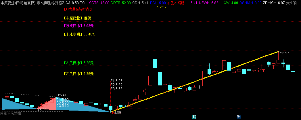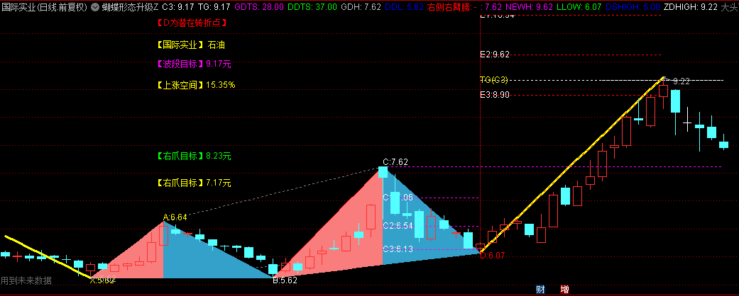 2、蝴蝶形态:蝴蝶形态是一种对称的价格结构,其形态类似于蝴蝶展翅的形状。蝴蝶形态往往预示着价格趋势的反转。