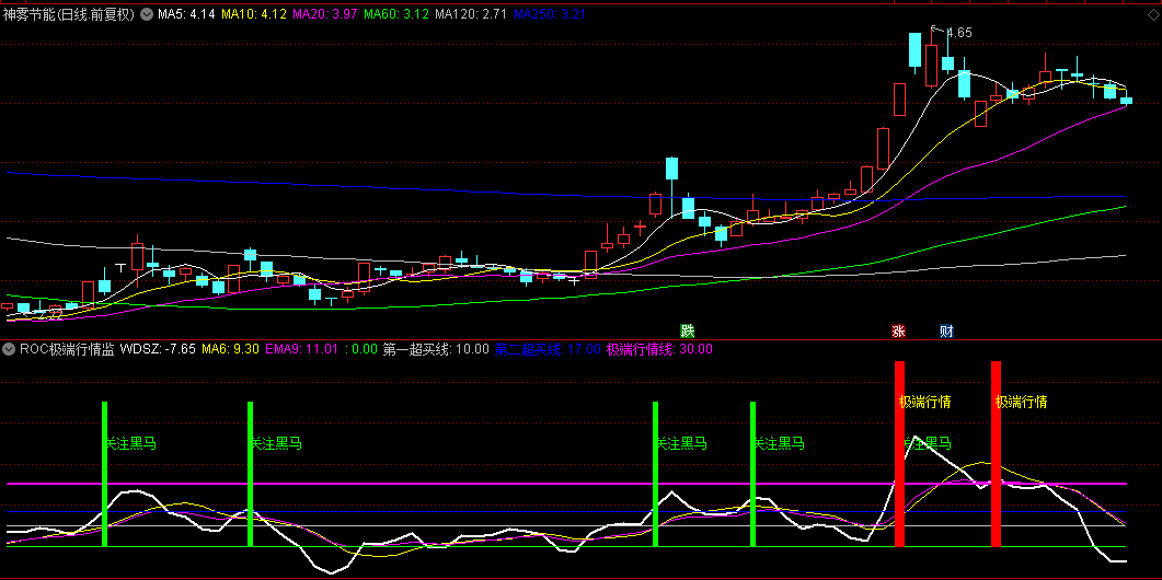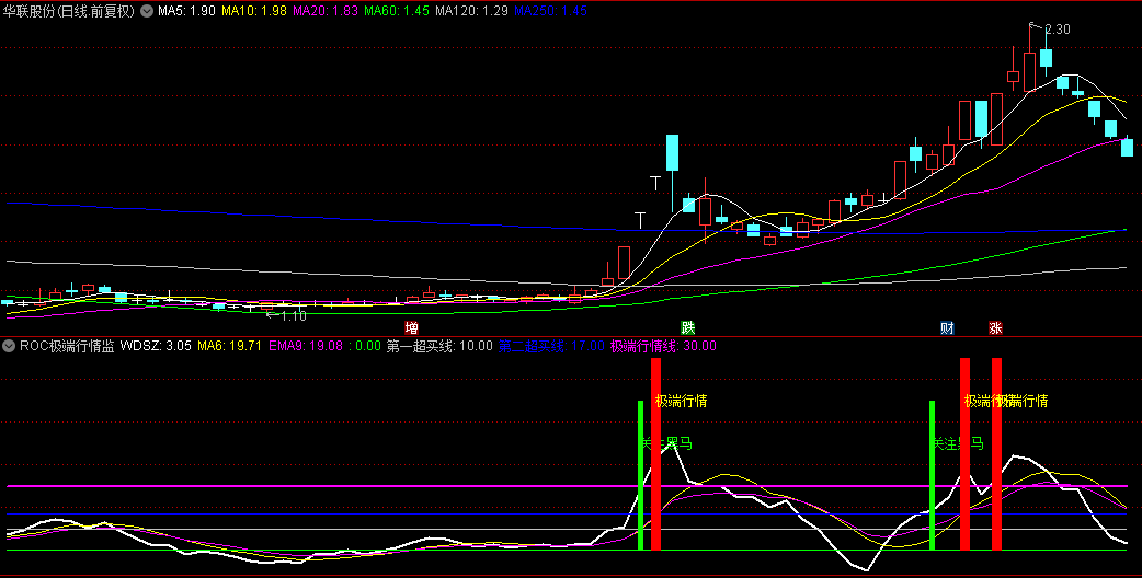 当ROC上穿极端行情线时,在70的位置显示“极端行情”的文字提示,颜色为黄色。