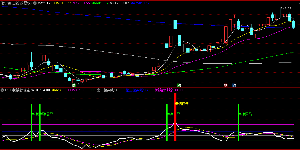 当ROC上穿第二超买线时,在50的位置显示“关注黑马”的文字提示,颜色为绿色。