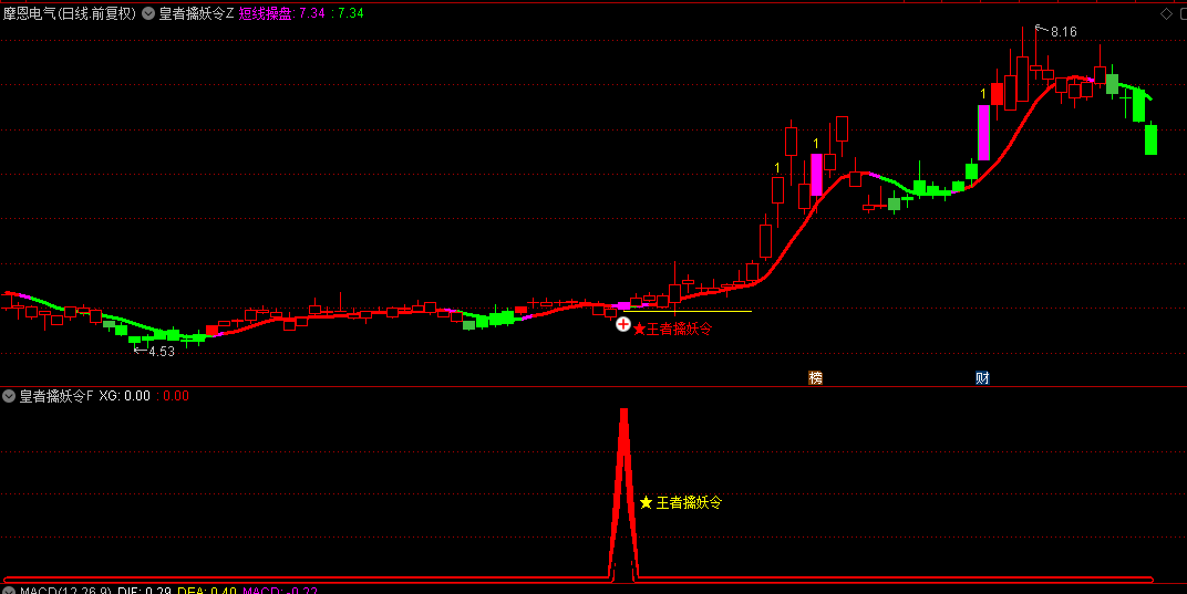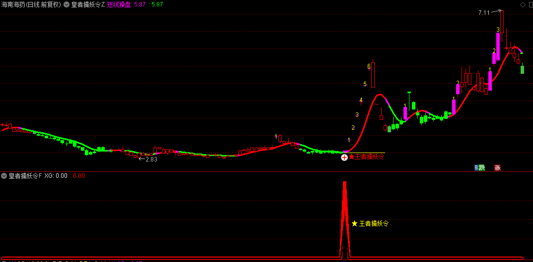 皇者擒妖令指标包括1主图,1副图,1选股,适合没有时间看盘的用户,信号极少,