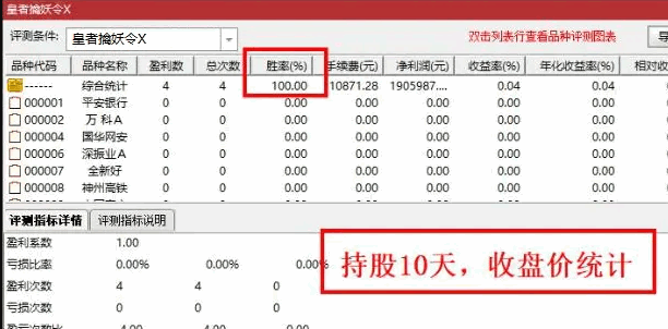 统计胜率:信号出现后,持股10个交易日的最后收盘价卖出,胜率百分百。