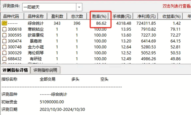 持股周期5天,胜率:86.62%。正向年收益72.4万;共出手396次。
