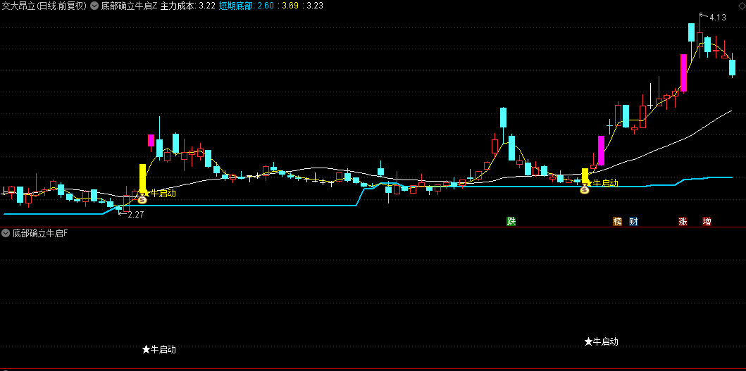 通达信【底部确立牛启动】主图/副图/选股指标,多头发散起始点,向上变盘标志!