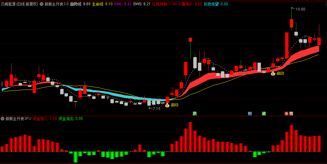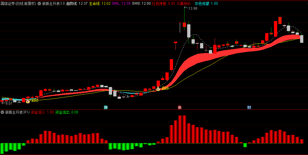 "新版主升浪"是一种结合K线颜色、资金流向以及趋势线分析的个股交易策略指标。