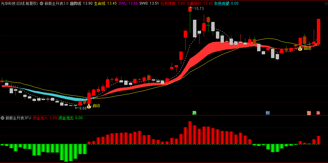 1、股友们应密切关注主图和幅图中的信号变化。当同时出现"红色K线+红色资金流入柱子+股价站上趋势线"之上时,出现“钱袋子”主升浪启动信号的出现。