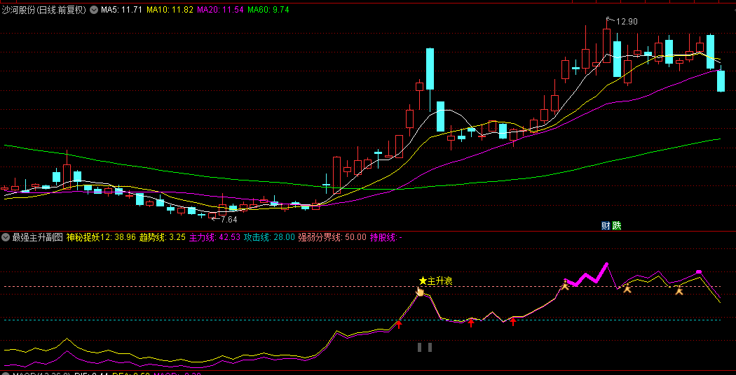 7、如果捉妖线从下方穿越了主力线,则表明股票走势开始转强,此时应予以观察。