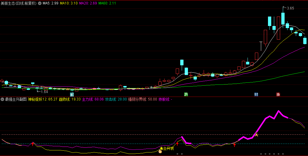 9、在捉妖线实际突破或是即将突破的关键时刻,可能会伴随着主升浪的出现或者出现向上箭头标识,这些都是主力强烈做多意愿的表现。