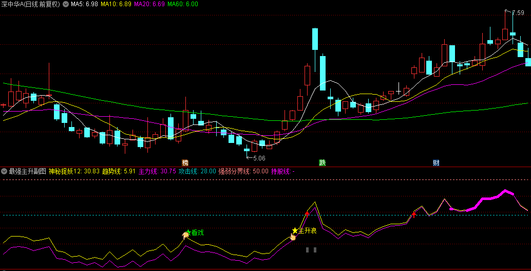6、当捉妖线位于主力线下方时,通常意味着股价尚未展现出强劲的上涨势头,因此暂时可以不予重点关注。