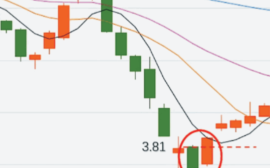 2.阴阳K线的止跌阳线开盘价要高于阴线的收盘价,收盘价要高于阴线的开盘价,且越高越好。且止跌阳的量能要比最后一根阴线量能小,缩倍量最好。
