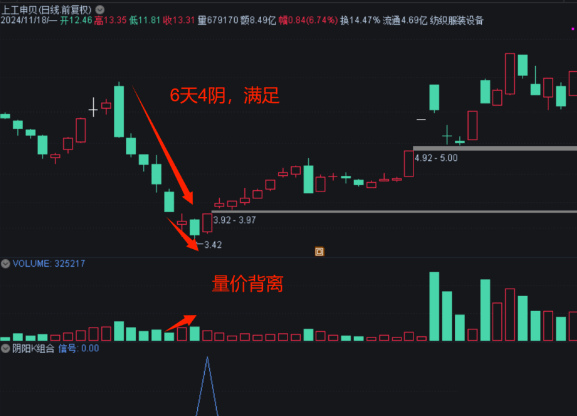 1.阴阳K线的形成一般在下跌末期出现一波连续下跌,至少出现六天四阴,且最后三天连续阴线,牛市可以四天三阴。