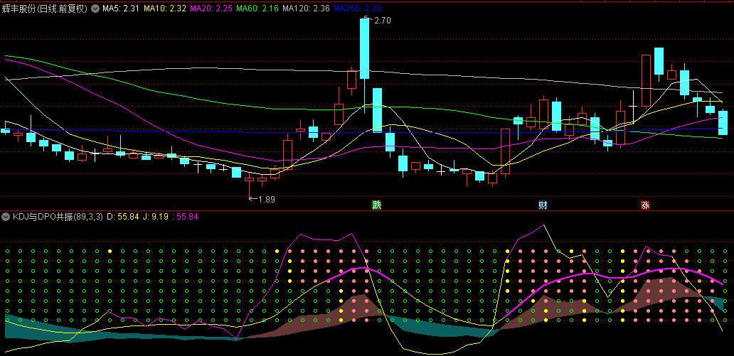 这是在原始KDJ基础上,整合了89周期的kdj及dpo和均线(红绿点)。