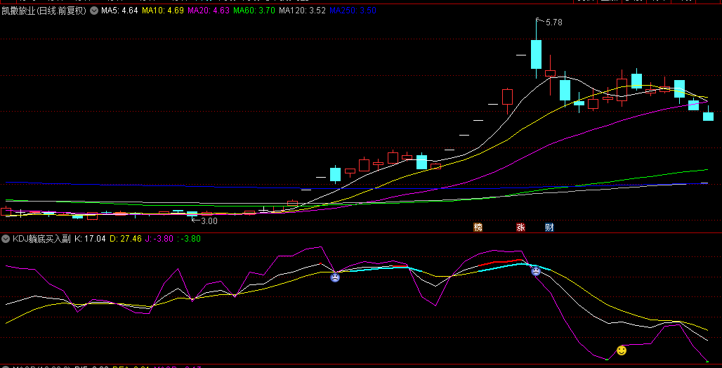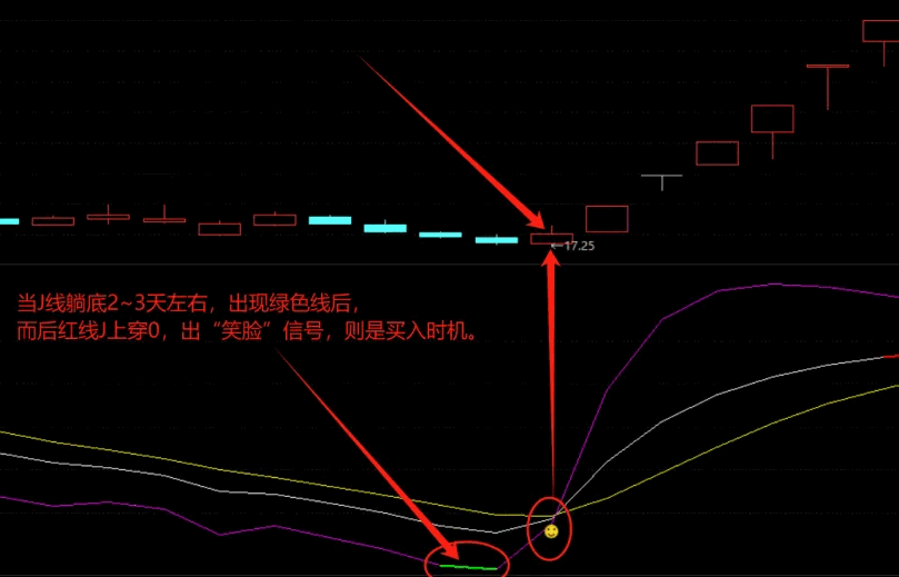 当J线徘徊于底部区域,持续约2至3日之久,随后绿色线出现,紧接着,红线J奋力突破0轴,此刻,出笑脸信号,正是捕捉买入契机的黄金时刻。