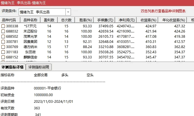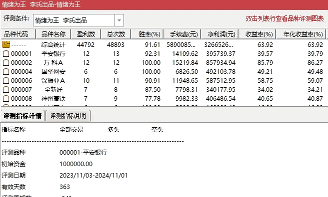 经过一年数据回测,该波段指标胜率高达91.6%,全市场所有A股平均年化收益高达63.9%(被没有信号的个股摊薄后的数据,也没有计算复利,实操中没有信号的标的就不会做,所以不存在摊薄的情况,再加上复利效用,实际年化收益会远远高于63.9%)。是不可多得的“高胜率与高收益率兼顾”的优质高效指标(有很多所谓的高胜率指标实际上是以牺牲收益率为代价换来的表面光鲜:胜率90%多,年化收益1、2个百分点)。