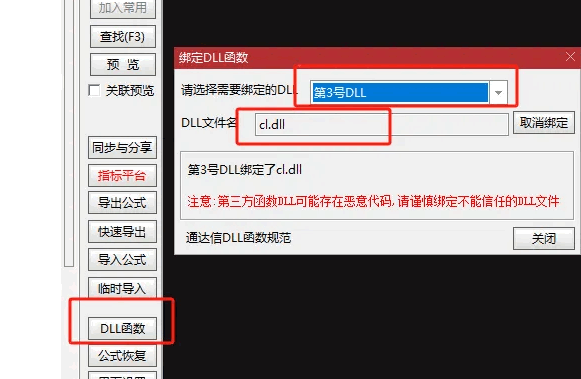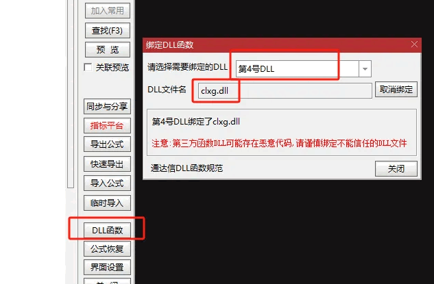 然后打开公式管理器--DLL函数--3号绑定cl.dll文件,4号绑定clxg.dll文件。