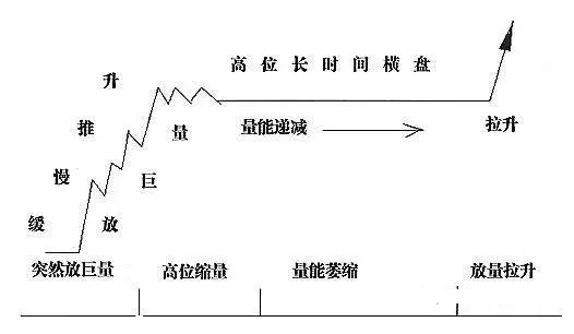 4、放巨量缓慢推高、高位横盘、直接拉升