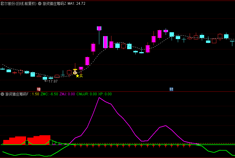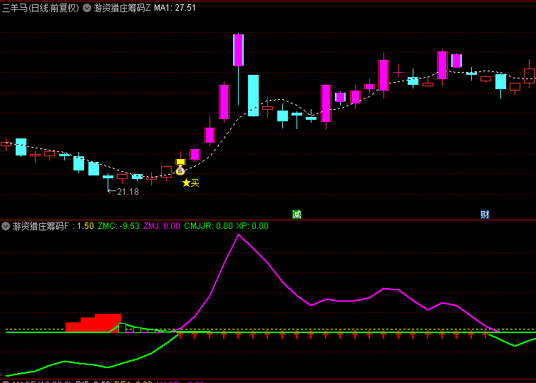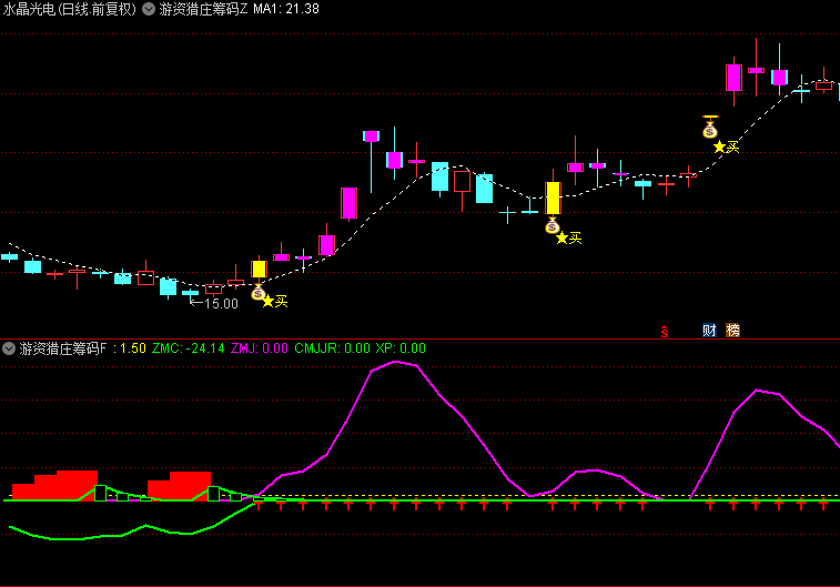 1、主图紫色K+”钱袋子”+副图洋红色线+”红箭头”信号,入场;