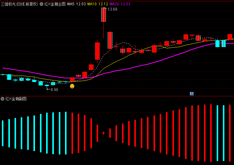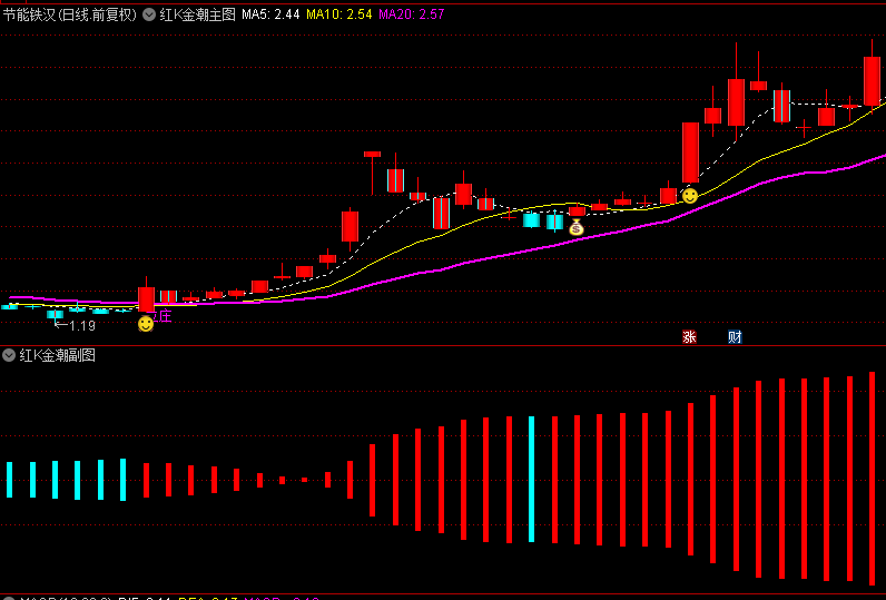 6、当首次同时出现MACD红柱多头、股价位于5日线上方以及主图中红色K线时,指标将发出“笑脸信号”,表示市场处于强势上涨阶段,此时可继续持有。
