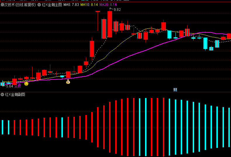 2、主图中红色K线表示股价上涨,此时应持有个股;蓝色K线表示股价下跌,此时应暂时休息,避免参与市场波动。