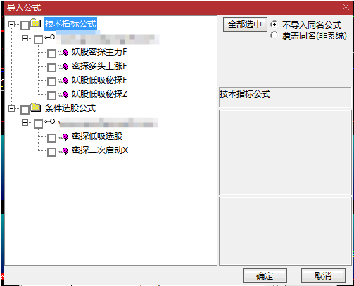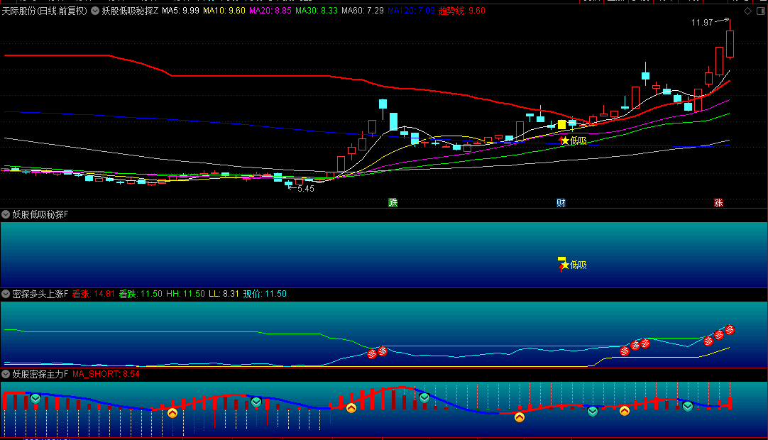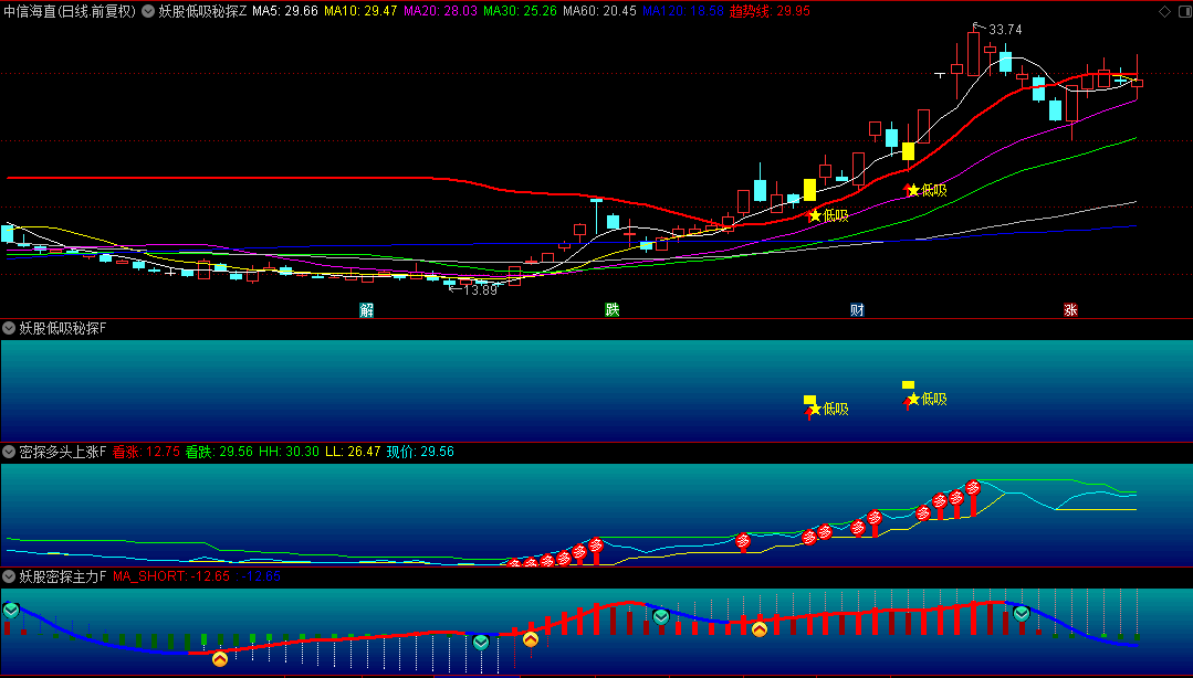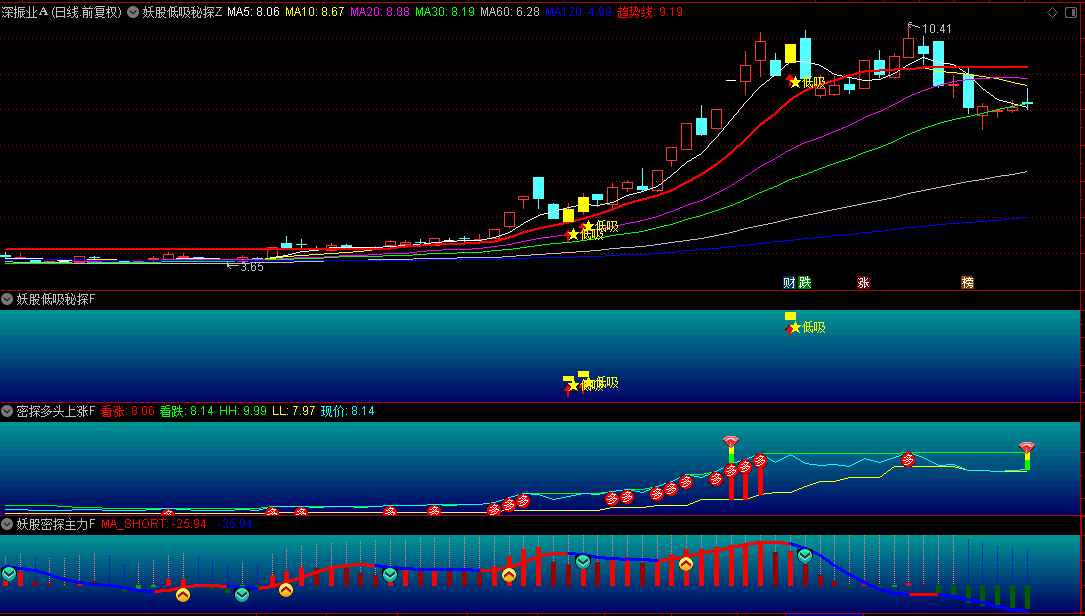 从某电商平台购买的【妖股低吸秘探】套装指标,分为主图、副图和选股,有六个的,导入就见到了。