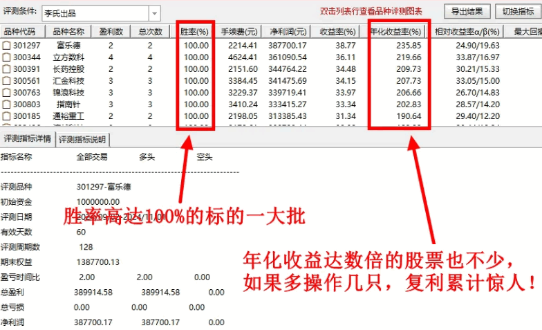 经回测,全市场平均胜率近90%,胜率达100%的股票有一大批,年化收益达数倍的股票也不少。如果多跟踪几只股性活跃的票,一年下来,累计复利相当惊人!