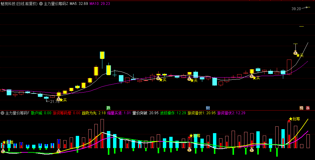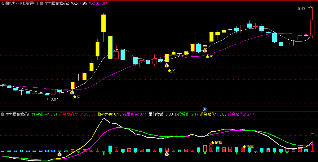 当量能柱由绿变红,并且出现“抢筹”信号时,说明市场中的买盘力量开始占据主导地位,这通常意味着股价可能会进入上涨趋势。