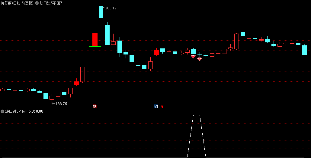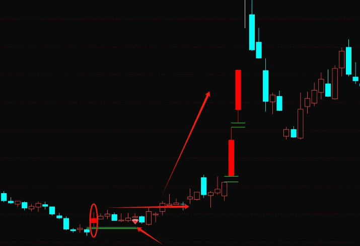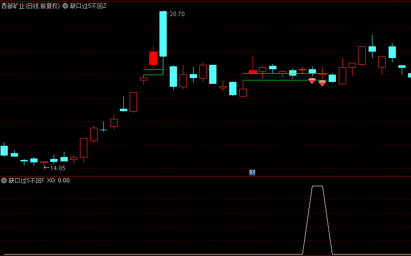 主图中显示的红色k线,是跳空高开留下缺口的一根k线,这个k线最好不要是涨停板,是小阳线最好,量能必须是放量的,倍量最好;