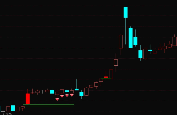 当某一天,量能萎缩到极致,会出现买点信号,也就是主图中的红钻信号,选股指标就是做出整个位置的选股;