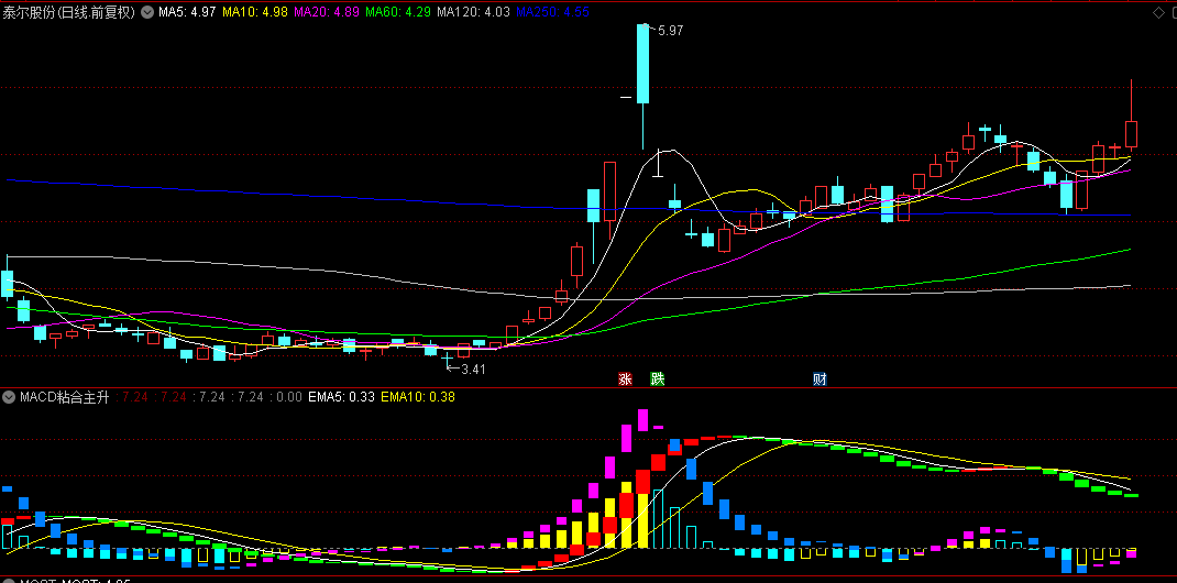 当粉色与黄色信号线同步金叉,且三者即MACD线、均线及粘合点紧密相依时,便预示着股价爆发性上涨的良机悄然而至,涨幅与力度均将令人瞩目。