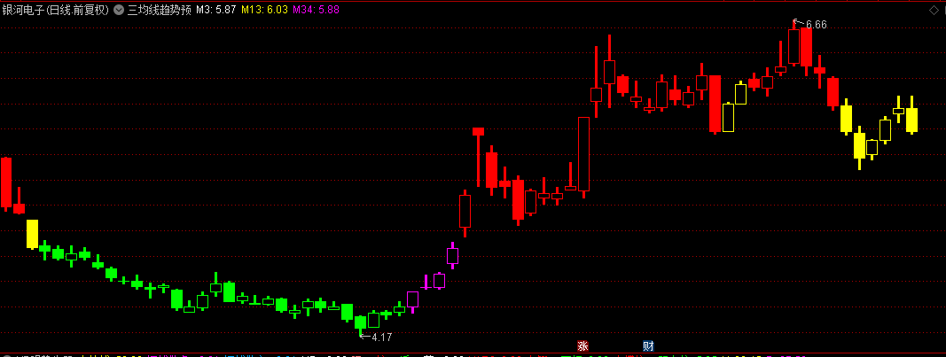 若短期均线M3上穿于中期均线M13之上,且长期均线M34呈现上扬态势,K线变成红色,预示着市场正处于蓬勃的上升通道。