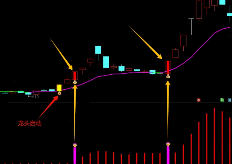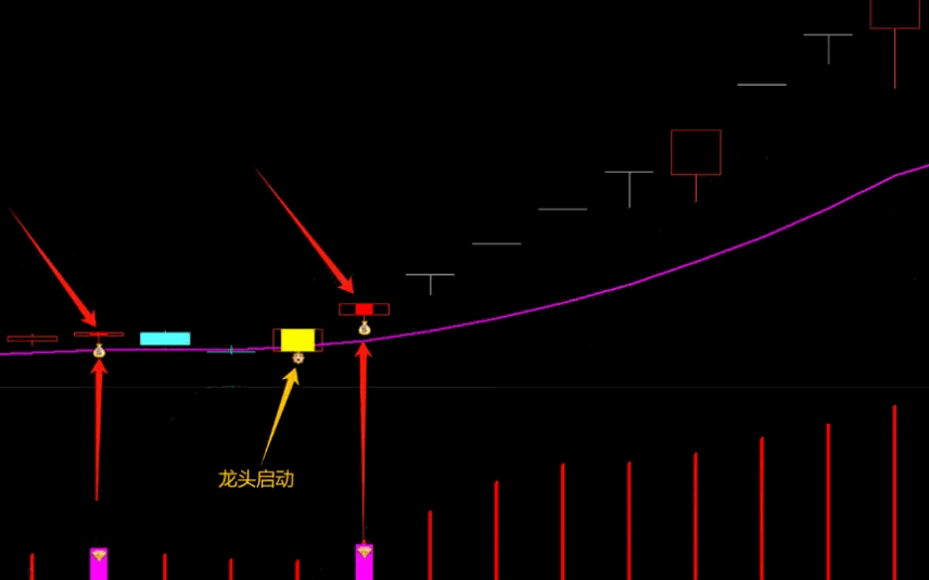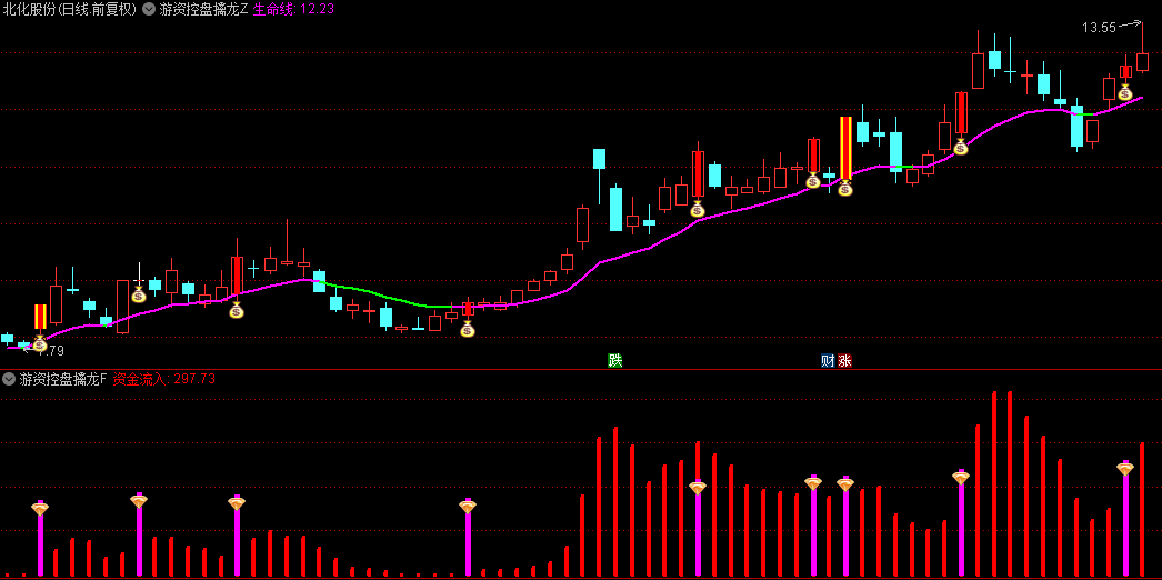 3、当股价首次出现资金流入,并同时站上主图的红色生命线之上时,指标将发出“黄钻石紫色柱子”信号。此信号标志着资金开始积极介入,庄家控盘力度增强,是股价即将启动上涨的明确信号。
