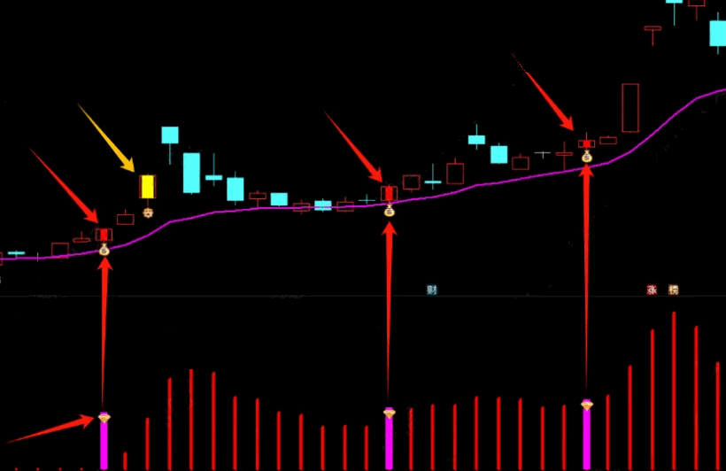 4、在主图上,与“黄钻石紫色柱子”信号对应,将出现“钱袋子”信号,进一步确认资金的积极流入与股价的强势表现。是为了提供明确的参与信号,助力把握市场机遇。
