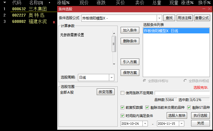 选股指标选股时间就是尾盘或者盘后,进场点就是尾盘或者次日开盘,止损是炸板次日的最低点,破位要暂时离场;