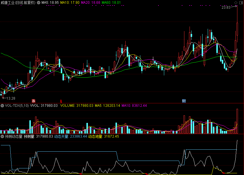 动态天量:IF(REF(V,1)=HHV(V,20),REF(V,1),REF(REF(V,1),BARSLAST(REF(V,1)=HHV(V,20)))),COLORFFCC66;