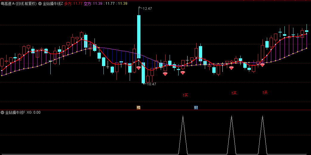 当同时出现买文字提示和红钻的时候,是强势买点信号,做出来的选股指标,就是同时出现这两个信号的位置;
