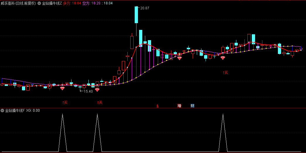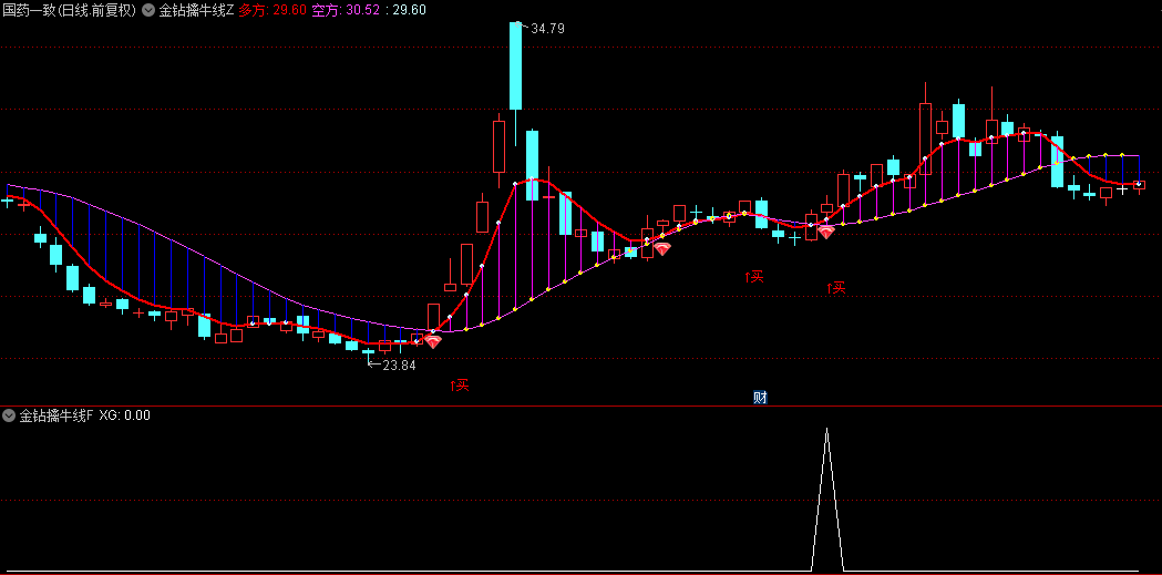 主图中有两个信号,一个是红钻,一个是买的文字提示,当这两个信号先后出现,间隔时间不太长的时候,往往是妖股主升浪开启的标志;
