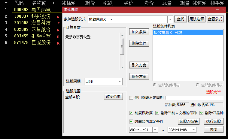 通达信精品【极致尾盘】副图+选股指标,每天一个点,成功率99.8%,无未来函数,可回测!