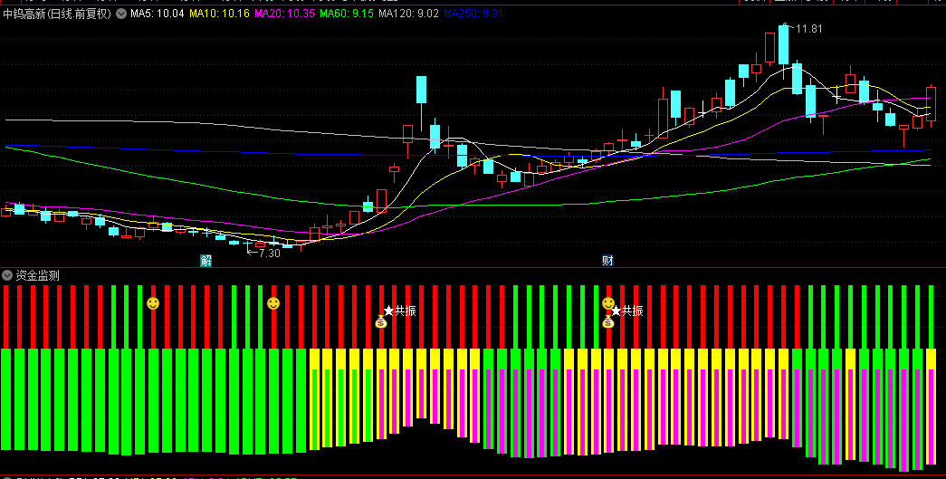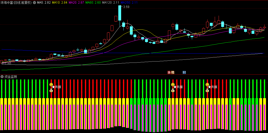 资金监测指标是股票市场中用于分析资金流向和市场情绪的重要工具。该指标主要分为短线资金、中线资金和长线资金,通过不同颜色的柱子来表示不同类型的资金流向。以下是对资金监测指标的图例解读: