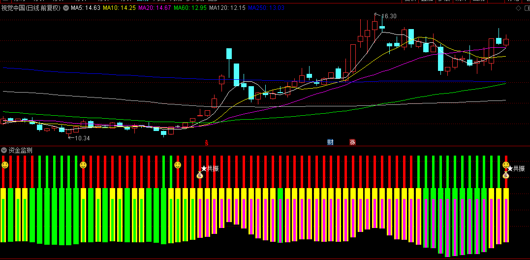 笑脸信号:当短线资金(红色柱子)和中线资金(黄色柱子)同时出现时,产生共振,系统会发出“笑脸”信号。这通常意味着短期和中期资金共同推动市场上涨,是一个较为强烈的买入信号。