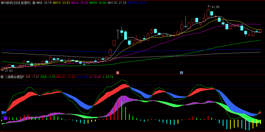 这里说的二指糅合的二指,指的是两个经典的指标,一个是MACD,一个是KDJ,只不过这里我把参数调整了一下,做到最贴近实战的状态;