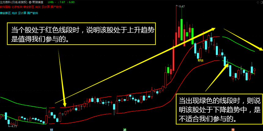 当出现绿色的线段时,则说明该股处于下降趋势中,是不适合我们参与的。