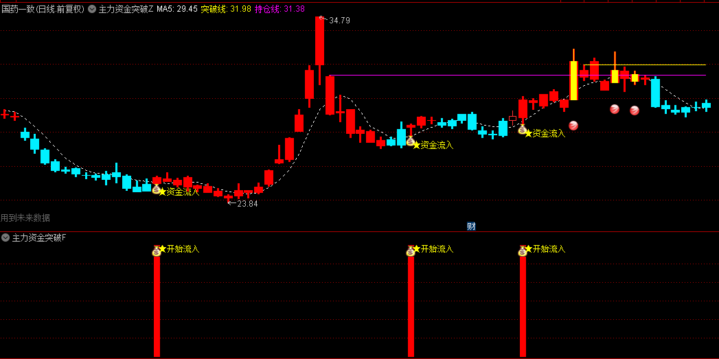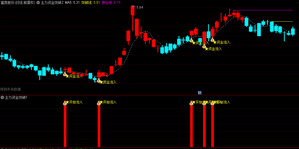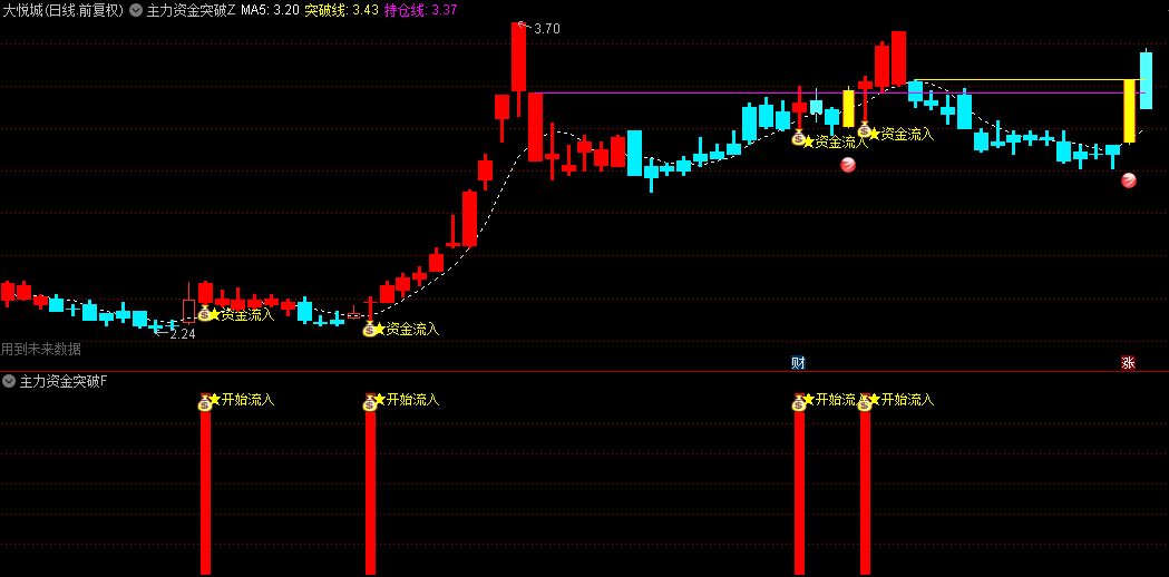 2、第一次多头趋势流入时,显示“钱袋子”资金流入信号;副图显示”开始流入“,为买入信号;