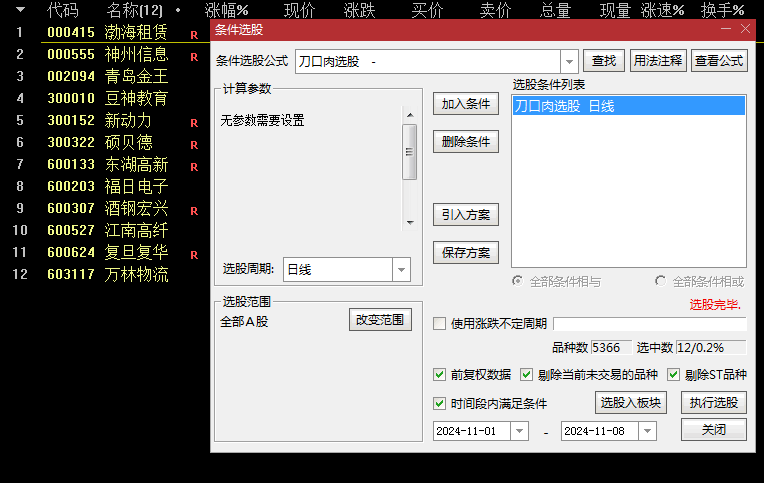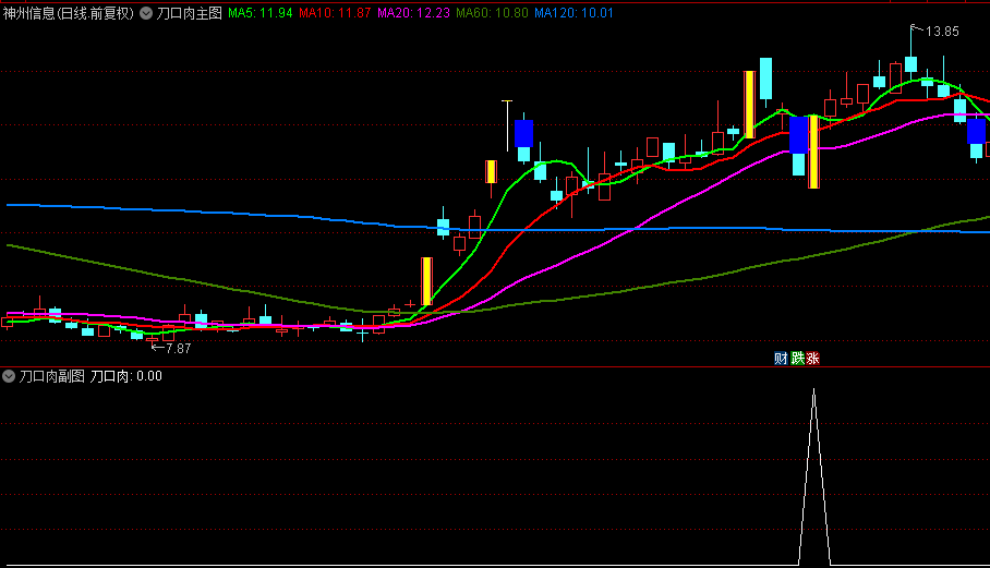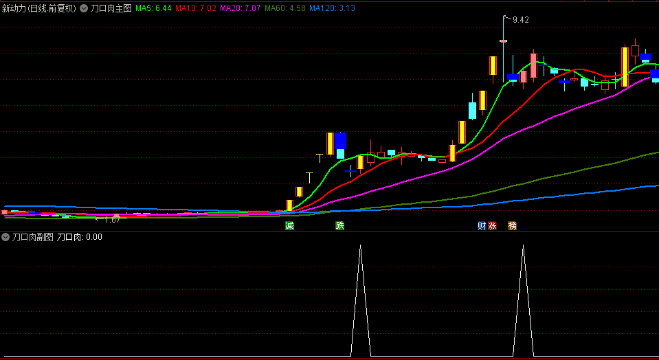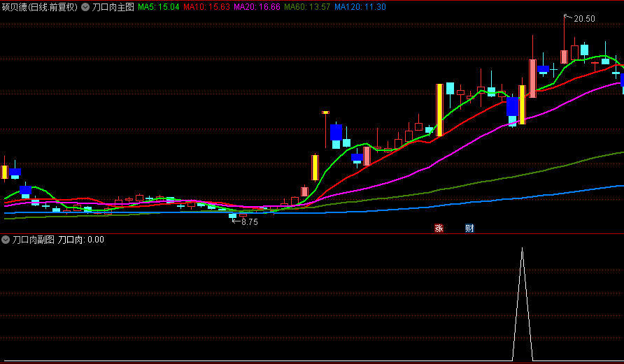 [刀口肉]是本人在2015年借鉴高手的理念编辑自用的一款短线指标,信号取自均线多头排列上涨的股票由几近跌停转升。