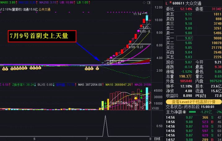 特殊案例,如下图的大众交通,在7月9号首阴,并史上天量,但前面没有涨停板或连板,怎么选出来?